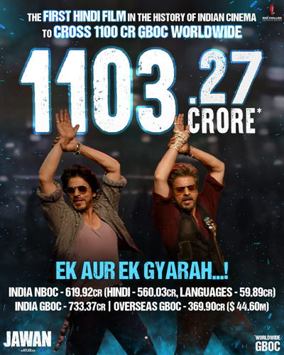 Jawan became the first Hindi film in the history of Indian cinema to cross 1100 Cr.! Collected 1103.27 Cr. gross worldwide!