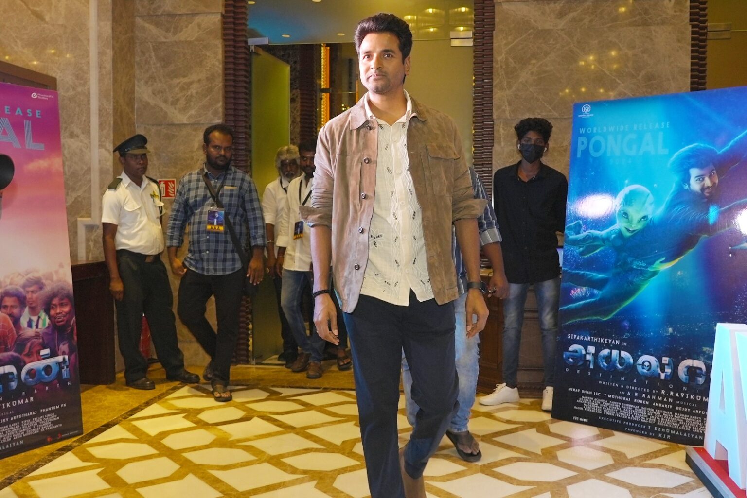 கேஜேஆர் ஸ்டூடியோஸ் சார்பில் கோட்டபாடி ஜே. ராஜேஷ் தயாரிப்பில் சிவகார்த்திகேயன் நடித்துள்ள திரைப்படம் ’அயலான்’. இப்படத்தை ரவிக்குமார் இயக்கியுள்ளார். ரகுல் ப்ரீத் சிங், யோகி பாபு, பானுப்ரியா, கருணாகரன் உள்ளிட்டோர் நடித்துள்ளனர். வேற்று கிரக வாசியை மையப்படுத்தி உருவாகியுள்ள ஃபேண்டஸி திரைப்படமான இது வரும் பொங்கல் விடுமுறையை ஒட்டி வெளியாக உள்ளது. இப்படத்திற்கு ஏஆர் ரஹ்மான் இசை அமைத்துள்ளார்.’அயலான்’ படத்தின் இசை வெளியீட்டு விழா சென்னையில் உள்ள தனியார் நட்சத்திர விடுதியில் நடைபெற்றது. இவ்விழாவில் சிவகார்த்திகேயன், ஏஆர் ரஹ்மான், மாரி செல்வராஜ், தயாரிப்பாளர் கேஜேஆர், கருணாகரன், இயக்குநர் ரவிக்குமார் உள்ளிட்ட படக்குழுவினர் கலந்து கொண்டனர்.