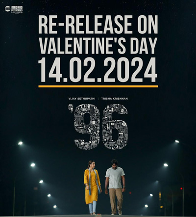 தமிழ் சினிமாவில் ஹிட்டான பல திரைப்படங்கள் ரீ-ரிலீஸ் கலாச்சாரத்தில் நல்ல வரவேற்பைப் பெற்று வருவதால் ‘ராம்-ஜானு’வின் உலகத்தை மீண்டும் பார்ப்பதற்காக ‘96’ படம் மீண்டும் வெளியாகிறது. ஒவ்வொரு முறையும் இந்தப் படத்தின் காட்சிகளைப் பார்க்கும்போதும், பாடல்கள் இசைக்கப்படும்போதும் ரசிகர்களுக்கு எல்லையில்லாத மகிழ்ச்சி கிடைக்கிறது. ரசிகர்களின் வேண்டுகோளுக்கேற்ப ‘96’ திரைப்படம் பிப்ரவரி 14, 2024 காதலர் தினத்தன்று மீண்டும் வெளியாக இருக்கிறது. கேஎம் சுந்தரம் பிக்சர்ஸ் இந்தப் படத்தினை தமிழ்நாடு முழுவதும் திரையரங்குகளில் அதிக திரைகளில் வெளியிடுகிறார்கள்.