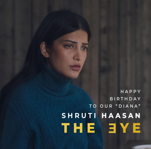 இந்த திரைப்படத்தில் ஸ்ருதிஹாசன் டயானா எனும் கதாபாத்திரத்தில் நடித்திருக்கிறார். இவருடைய பிறந்த நாளை முன்னிட்டு படத்தின் இயக்குநரான டாட்னே ஷ்மோன் அவருடைய சமூக வலைதள பக்கத்தில் ஸ்ருதிஹாசனின் கதாபாத்திர தோற்றத்தை வெளியிட்டு, ‘அற்புதமான மற்றும் துணிச்சல் மிக்க ஸ்ருதிஹாசனுக்கு பிறந்தநாள் வாழ்த்துக்கள். அவர் எப்போதும் எங்களின் ‘டயானா’வாக இருப்பார். லண்டன், கிரீஸ், அமெரிக்கா மற்றும் இந்தியாவை சார்ந்த ‘தி ஐ’ படக் குழுவினர் இந்த பிரத்யேக நாளில் உங்களை போற்றுகிறோம். கொண்டாடுகிறோம்@ ஸ்ருதிஹாசன் ” என பகிர்ந்து கொண்டிருக்கிறார்.
